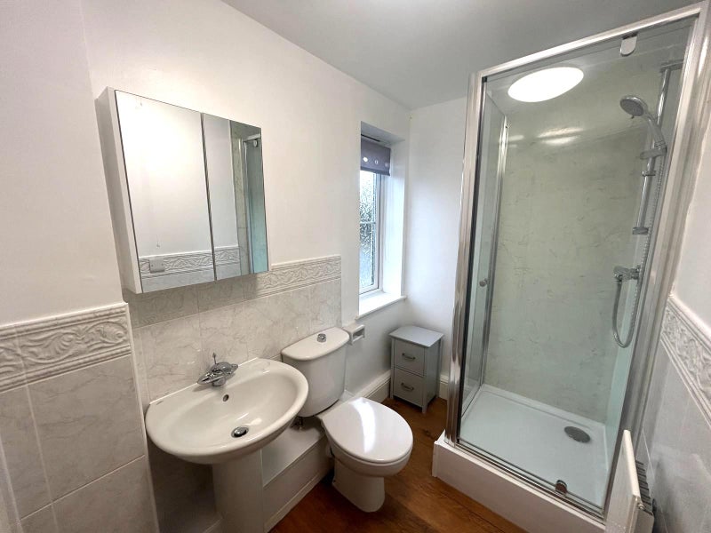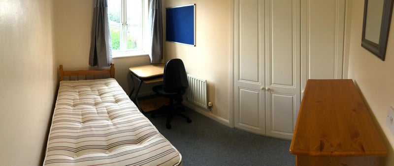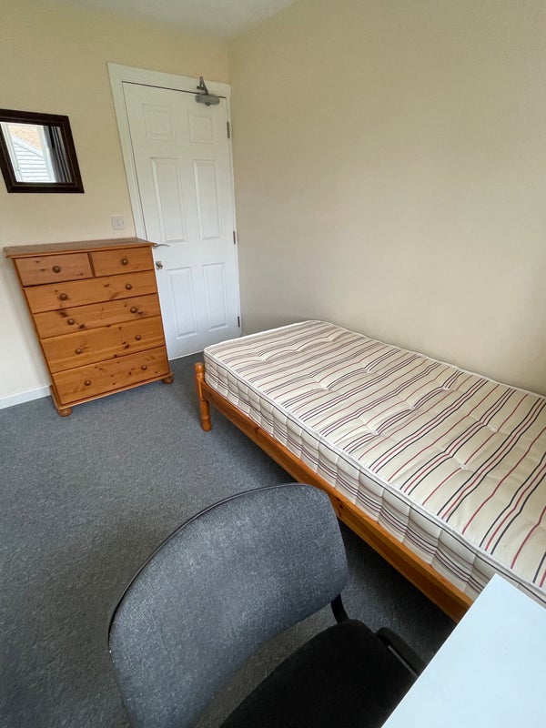 Single bedroom with triple fitted wardrobe, chest of drawers, desk and chair. This room shares a bathroom with one other tenant.