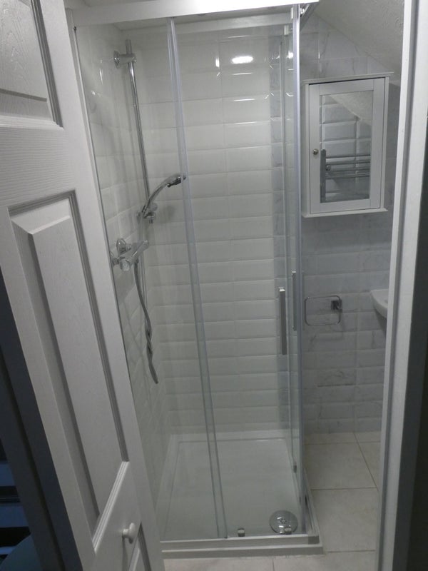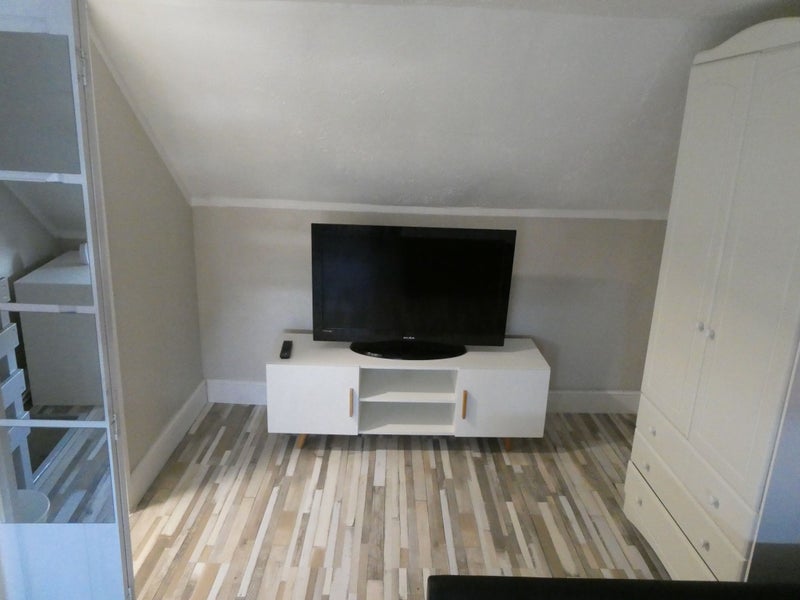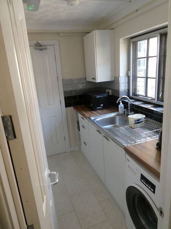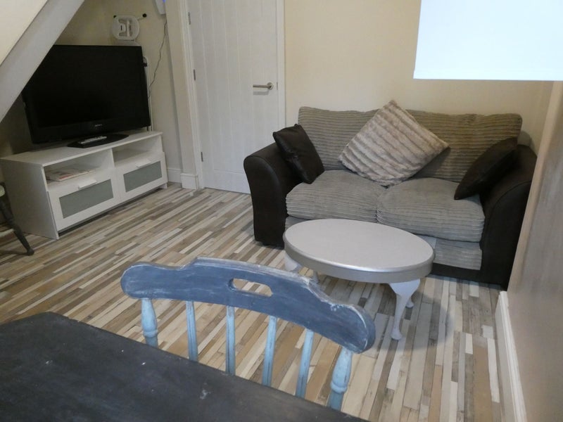 The communal kitchen is fully equipped with fridge-freezer, washing machine, oven, cutlery . There is one shared bathroom on ground floor. Communal living room with dining table, stools, sofa, coffee table and TV