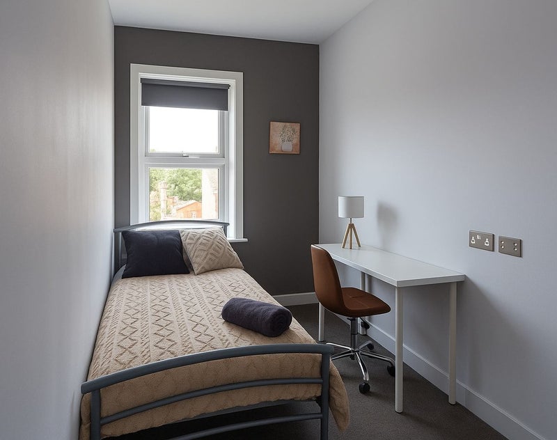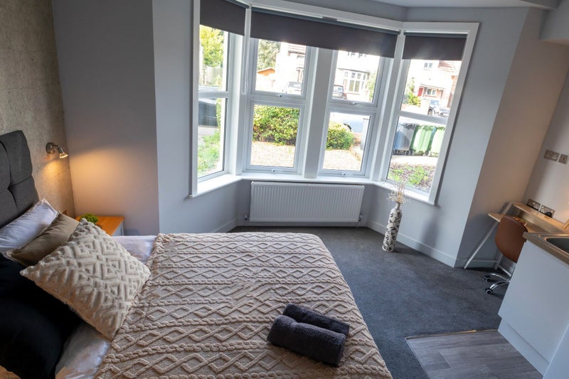 In our STUDIO ROOMS you get a comfortable double Divan bed & mattress, wardrobe, mirror, bedside table, chest of drawers, computer desk with a swivel chair, multiple electric sockets with additional USB ports, desk lamp, wall bedside spotlight lamps for comfortable reading, and blackout blinds.