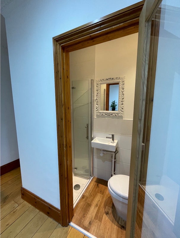 En-suite with shower, sink and toilet.