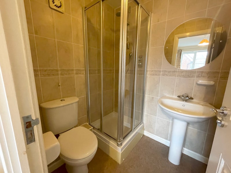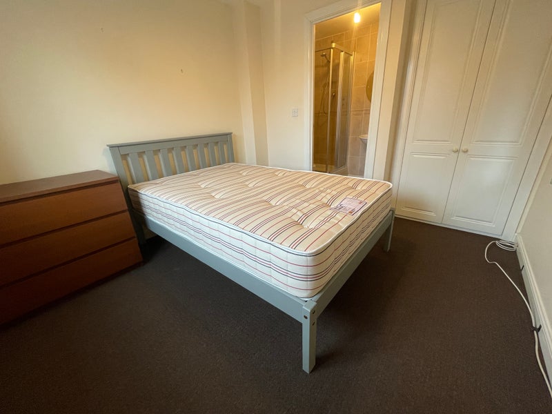 A double bed, chest of drawers, wardrobe, desk and chair and En-suite bathroom , which has a shower, sink and toilet.