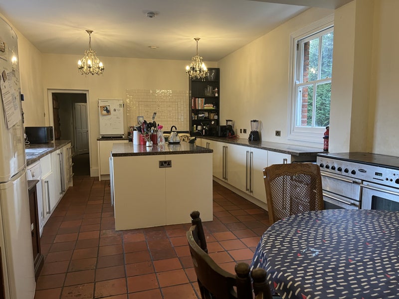 There is a very large spacious kitchen, with lots of storage space, fridges and work surface for everyone plus a dishwasher.