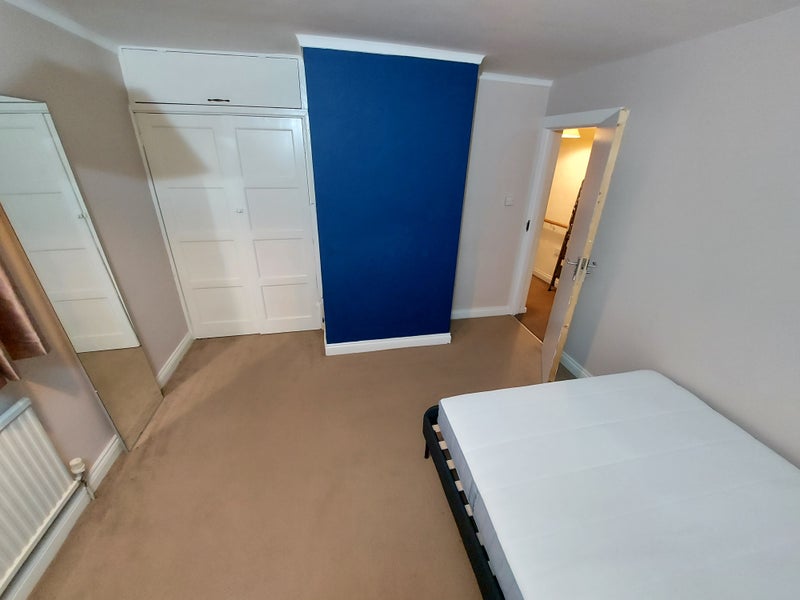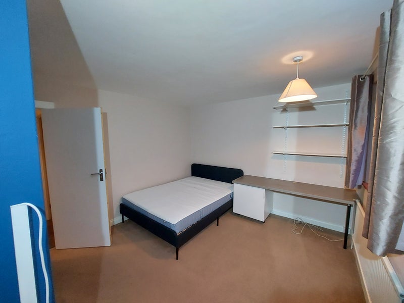 The bedroom includes a king size bed, large desk, and a double wardrobe. There is space for more furniture, which we will purchase according to the preferences of the tenant.