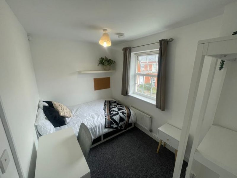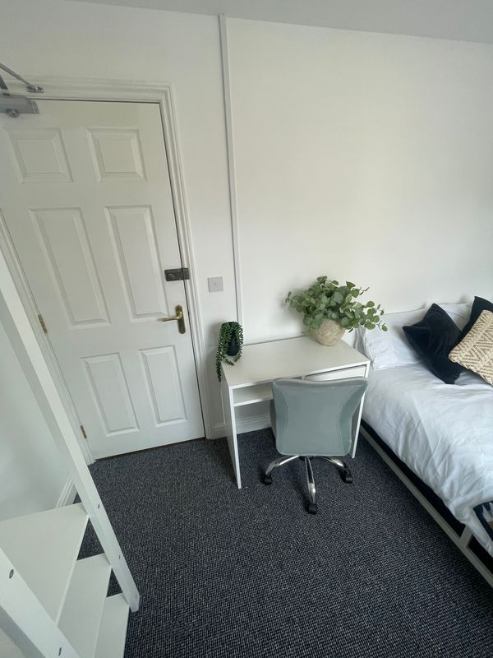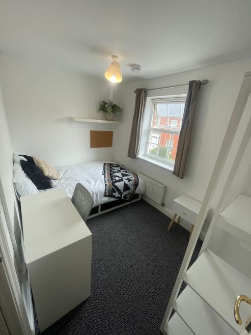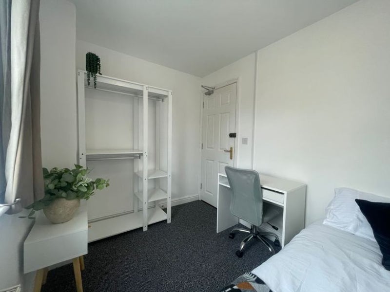Double bed, open wardrobe, bedside cabinet, desk and chair.