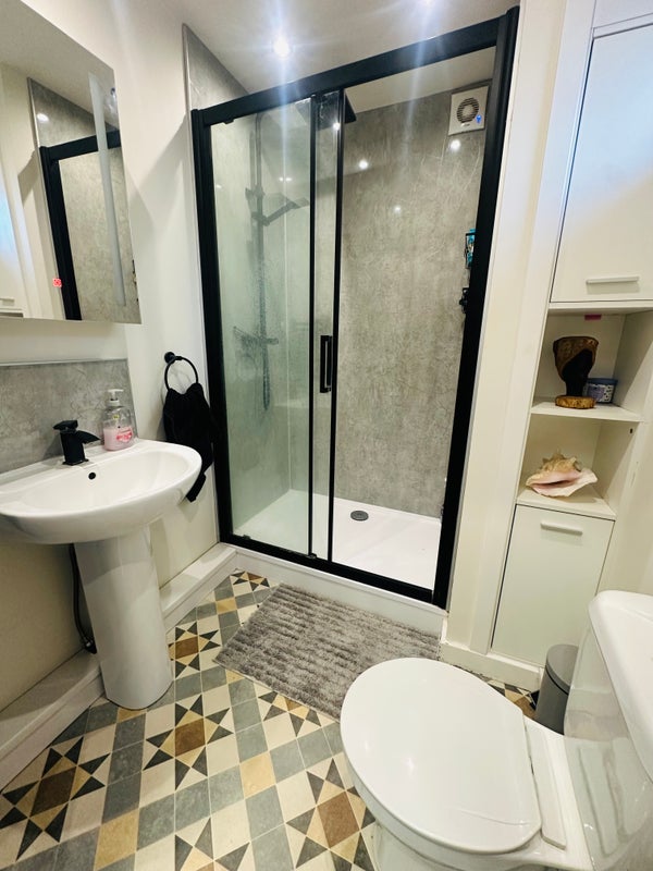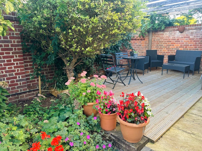 Shared kitchen (but with own fridge and cupboard space), spacious dining room and living room. Lovely walled garden with seating area.