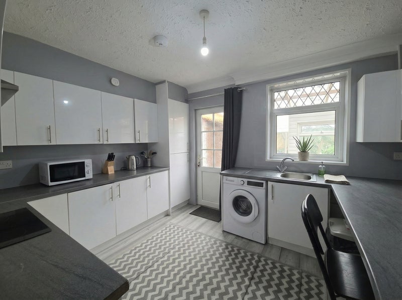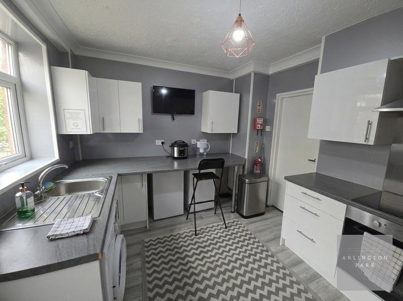 The house features a spacious communal kitchen and living area, fully equipped to handle shared living with three refrigerators, a larder freezer, a washing machine, a tumble dryer, cooking appliances, and a wall-mounted TV. Shared facilities include a first-floor contemporary bathroom with a walk-in shower, an additional separate WC, and a ground-floor lean-to. Outside, tenants can enjoy a beautifully tiered private garden complete with mature greenery and a storage shed, which is maintained by a professional gardener once a month.