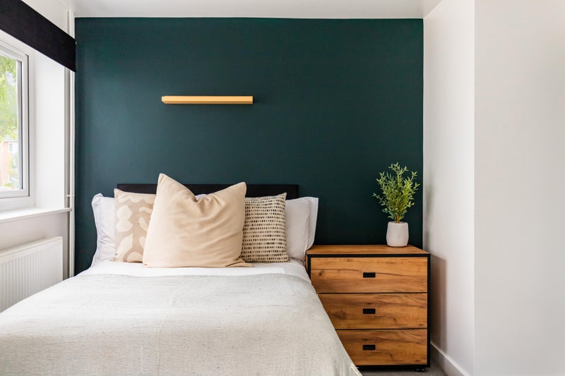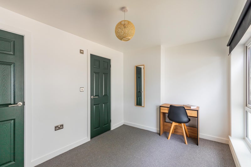 The room is one of the largest in the house and is fully furnished with a double bed, desk & chair, chest of drawers, and a large built-in wardrobe. The modern en-suite bathroom includes a shower, toilet and basin.
