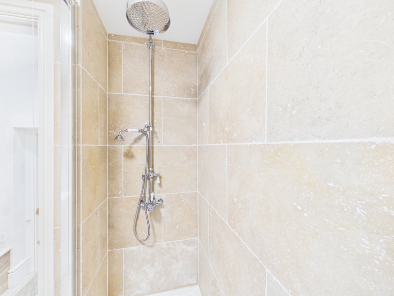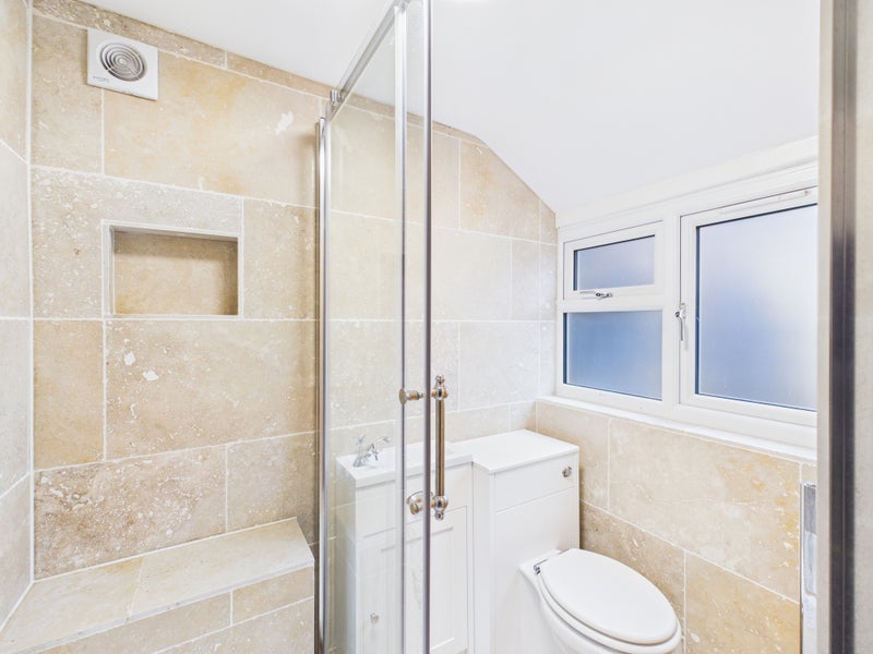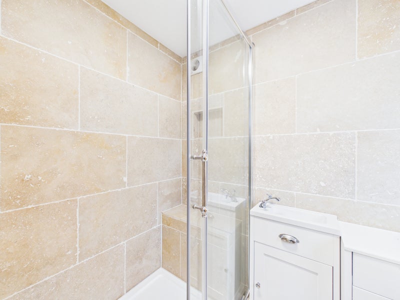 The contemporary shower room is finished to a high standard, with floor tiles and full-height wall tiling. Clean, modern and easy to maintain, it provides a sleek and practical space.