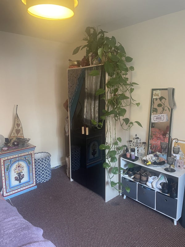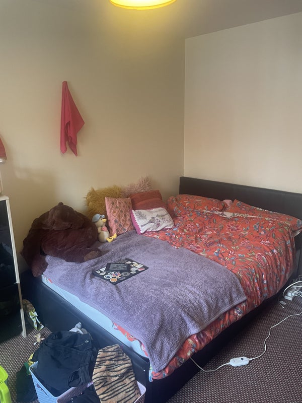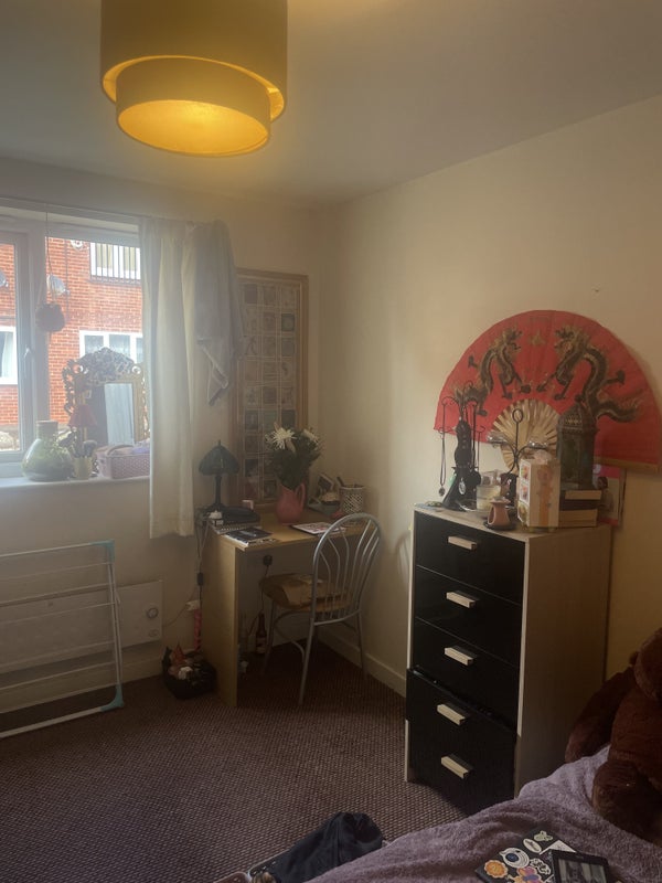 the bedroom is really big with loads of floor space. it will come with a bed, mattress, chest of drawers, wardrobe, desk and chair, curtains.