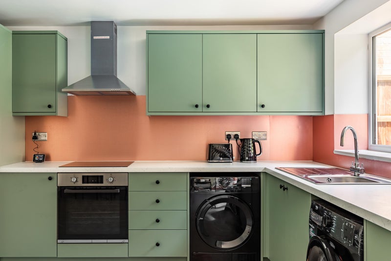 Downstairs you’ll find a large shared kitchen fully equipped with oven, fridge freezer, washing machine, tumble dryer and all essentials, plus a comfortable sofa and flatscreen TV area.