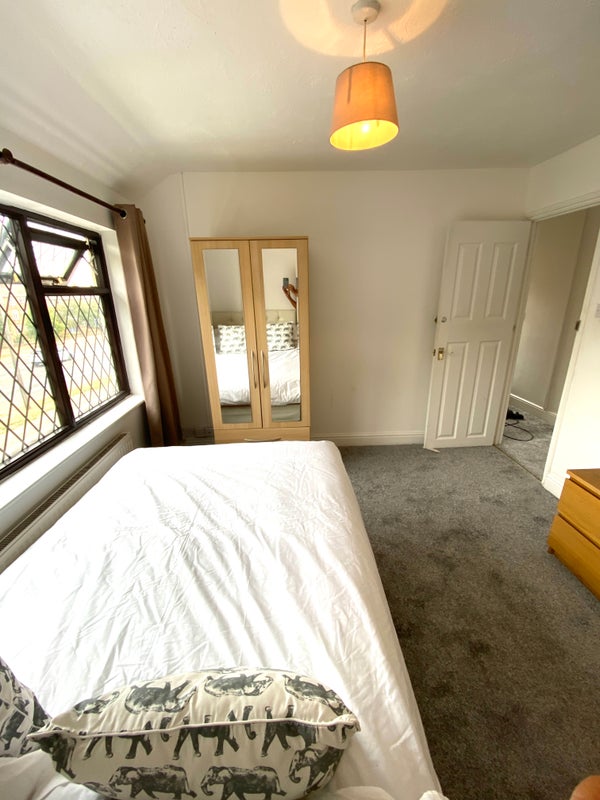 Spacious, light, double room with a double bed, mattress & mattress cover, triple wardrobe, bedside cabinet, chest of drawers & shelving. Desk & chair for home working. Airy and neutrally decorated with a TV point and lockable door for privacy. Shares modern shower room with just 1 other professional.