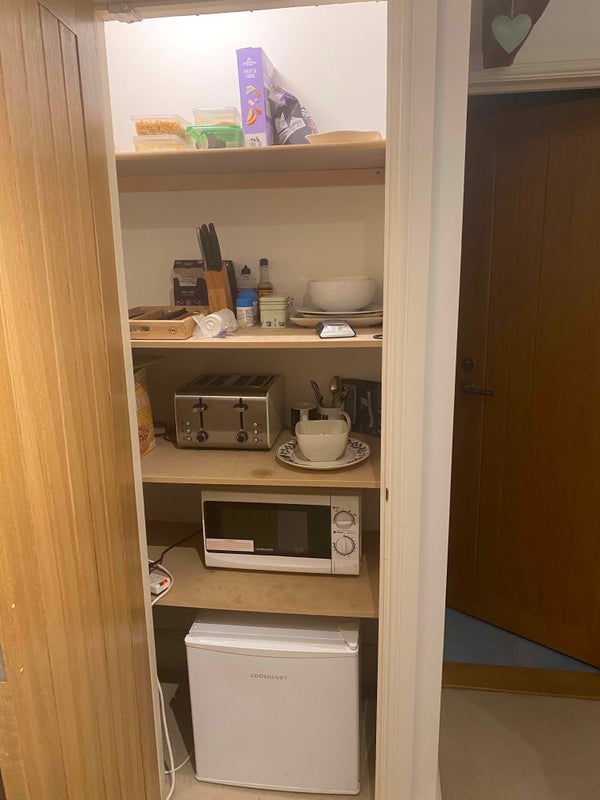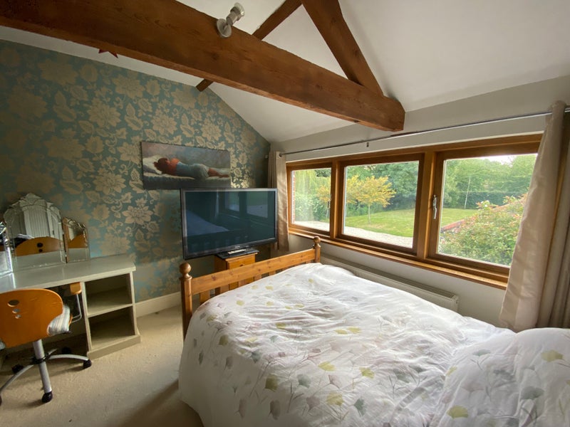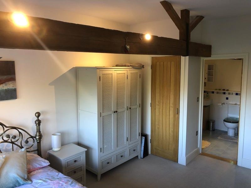 The bedroom is a large double with a very comfortable mattress and topper. It is beamed with a large wardrobe with both hanging space and shelves. Bed side table, desk and a chair also provided. Room also comes with all bedlinen including duvet, pillows, towels etc.