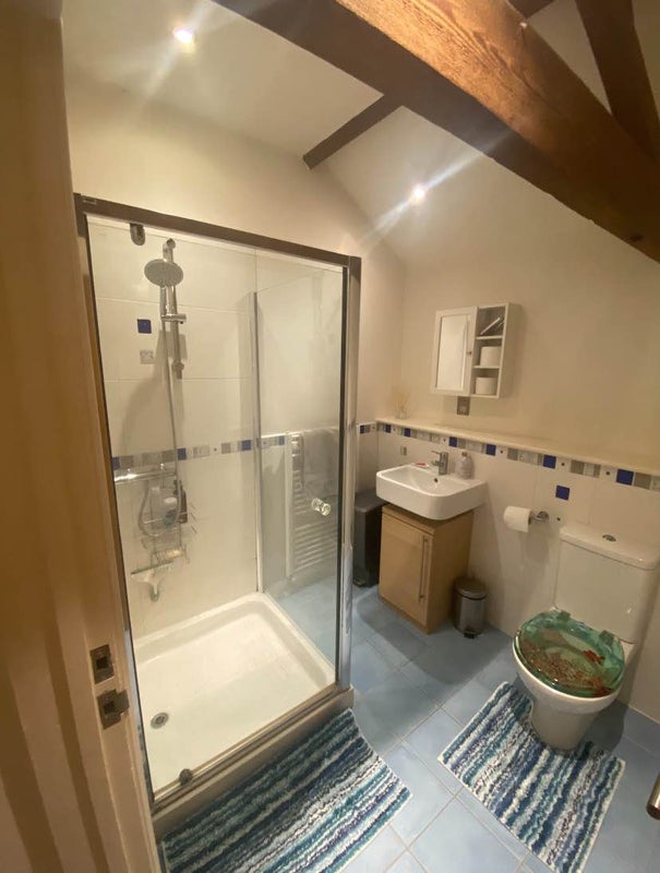 The large ensuite bathroom is also beamed and tiled in white and blue ceramic tiles and consists of a large power shower, sink and toilet with radiator.
