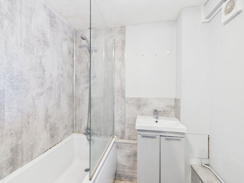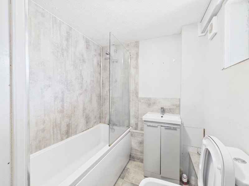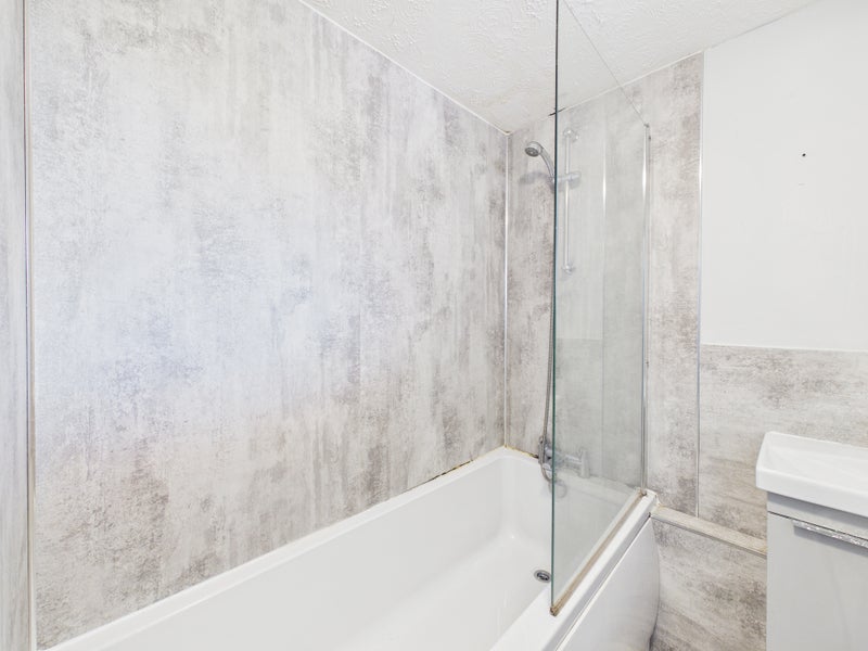 The modern bathroom is well-appointed and comprises a bath with shower over, wash hand basin, WC, and a sleek sink unit, all finished to a contemporary standard.