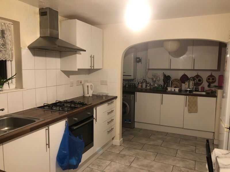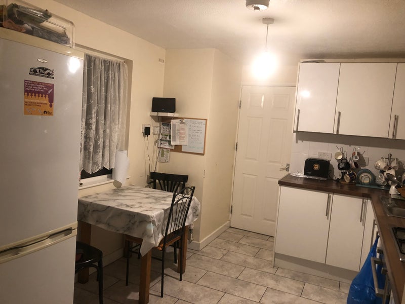 ✨ The house has a nice communal kitchen area with table and space for every tenants, a washer dryer machine, fridge freezer, and place to sit to eat and it looks out to the back garden area.