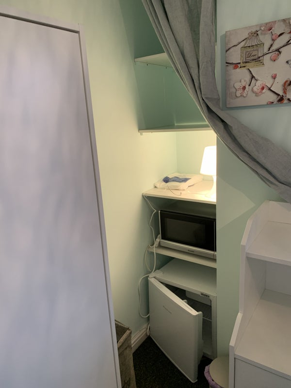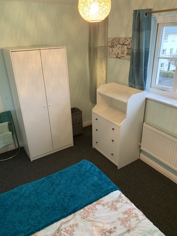 The room has a chest of drawers, chair, fridge, microwave, shelves and under-bed storage, wardrobe, bedside table, 4ft double bed, two lamps, bedding, and towels. The occupant has access to a shared bathroom with a shower. This bathroom is shared with a maximum of two other people and another toilet is available for use if the bathroom is occupied. The room has just had a full refurb so all the white furniture is new, there's a new carpet and it has been freshly painted.