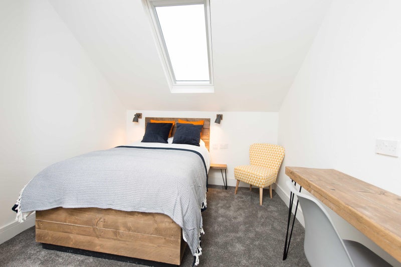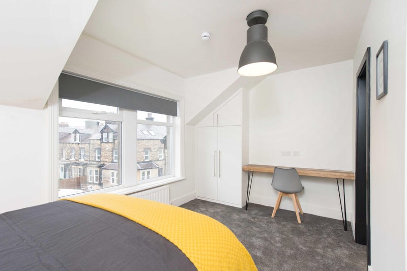 Room six - This bedroom is fully furnished, including double bed with under bed storage, desk and built in wardrobe and three piece ensuite. Modern and spacious; this bedroom is ideal for the working professional.