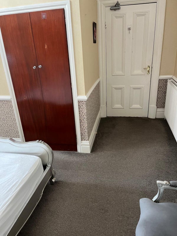 Room 1 is at first floor facing front garden. It’s en-suite with bathtub and shower over bath.
