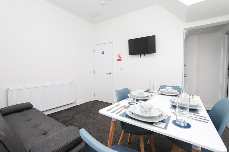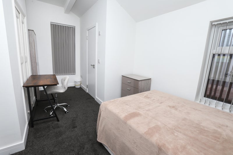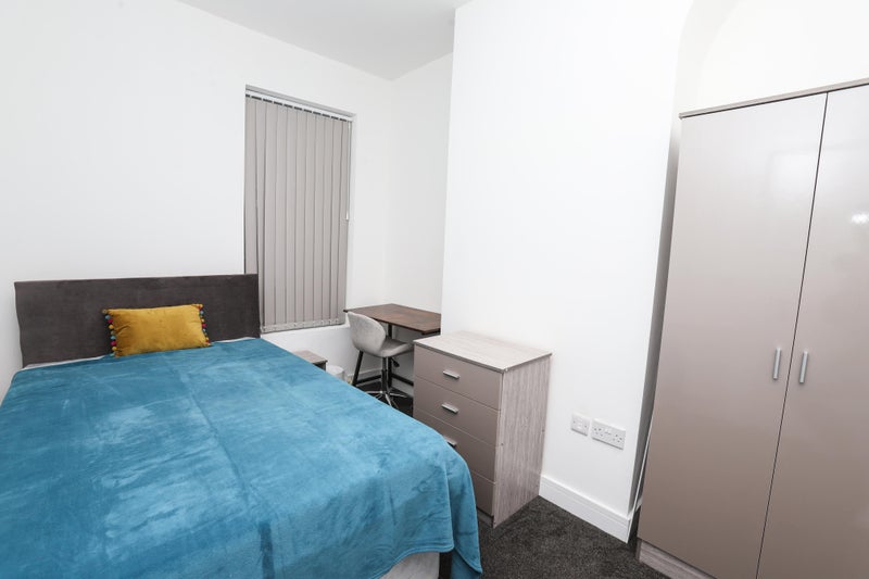 All rooms are fully furnished and newly carpeted, including the communal areas. Our units are provided with a television in the communal living area, pots, pans, dinner service and cutlery. The idea is that you arrive with your bag, towels and bedding, everything else is provided. The rooms include, double bed, wardrobe, desk, chair, bedside cabinet and chest of drawers.