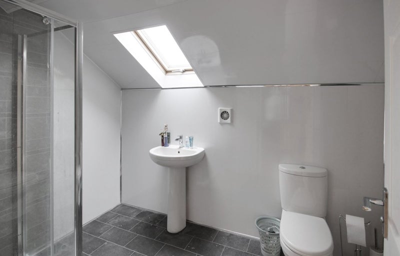 Spacious attic floor room - furnished bedroom with attached ensuite shower room.