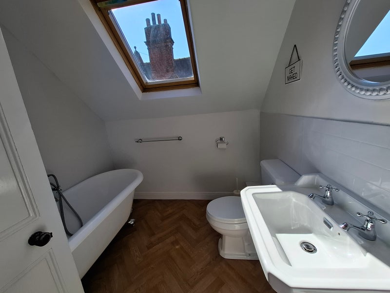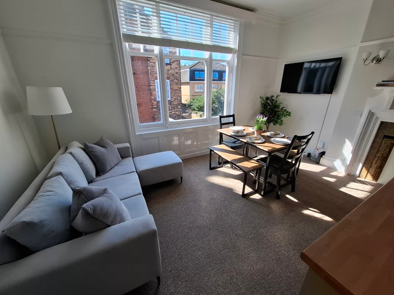 This is a large converted town house on Granville Road, which is a beautiful road in South Cliff. It's near the shops on Ramshill / Filey Road, and the Italian Gardens that lead down to the beach, but the road is very quiet. It has a leafy square with trees and a nice area of grass where you can go to relax in the sunny weather. The house has six rooms and two bathrooms, and it's kitted out to a very high specification with double beds in each room. When you go in, you go up a flight of steps straight away and onto the first floor landing, which is where you will find the kitchen / living room, the bathroom and three bedrooms. Up another flight of stairs are the other three rooms and the second bathroom, which has a nice bathtub in it.