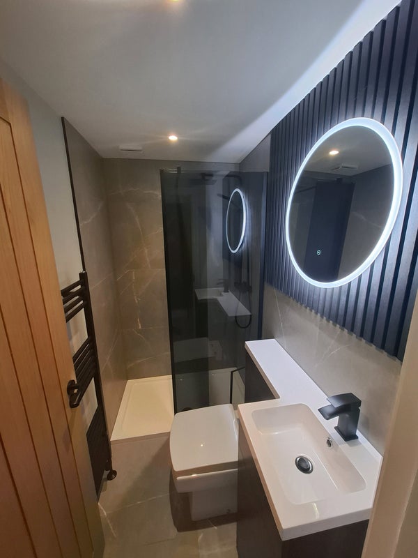 Room 4 - A large room at the front of the house with a double bed, pocket-sprung mattress & mattress protector, wall-mounted TV, double wardrobe with mirror, bathroom with double rainforest shower, toilet, basin & halo mirror, (with a built-in bluetooth speaker) and a lock on the door.