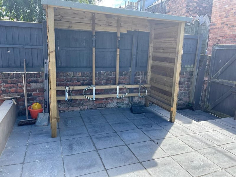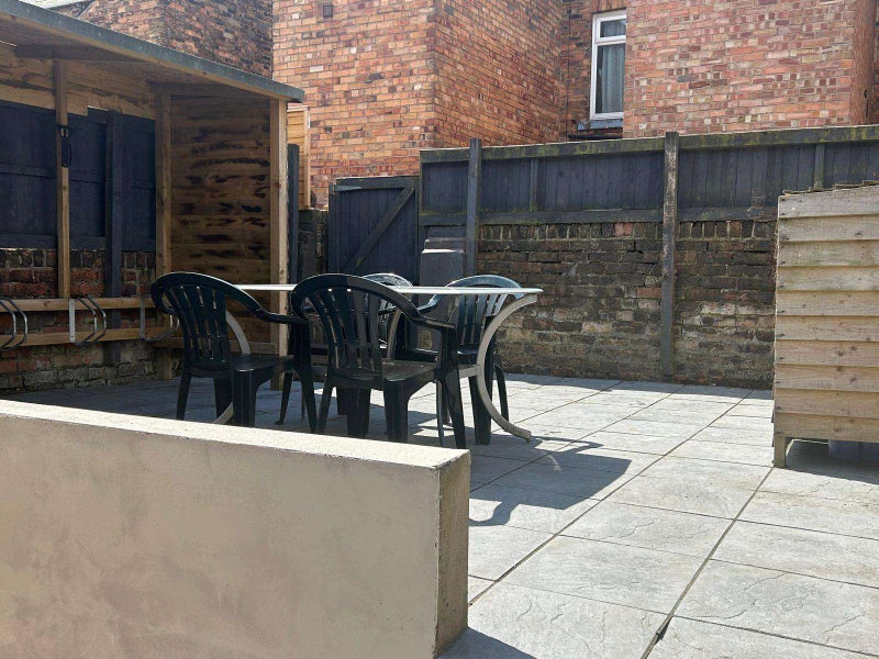 Outside is a flagged patio area, perfect for sunbathing or barbecues, as well as a covered bike storage area .