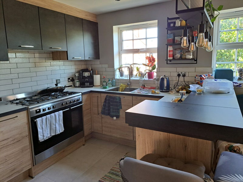 Shared new kitchen is well equiped (2 ovens, gas hob, electric kettle, toaster, airfryer, cutlery, pots and pans). Breakfast table for quick meals. There is one fridge/freezer, so the space is limited (to be shared sensibly).