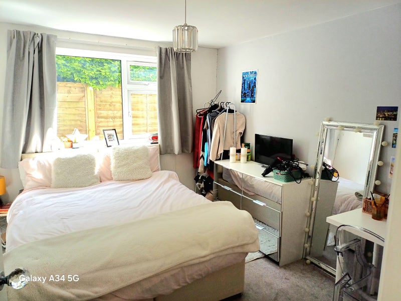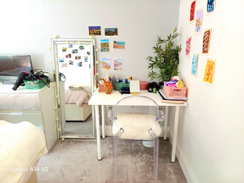 The ground floor double room is available from 20th June until 30th August 2026 . It contains a Kingsize bed, desk and chair, tall mirror, tv, clothes rail and mirrored drawers. Wet room/shower/WC located on the ground floor opposite room also.