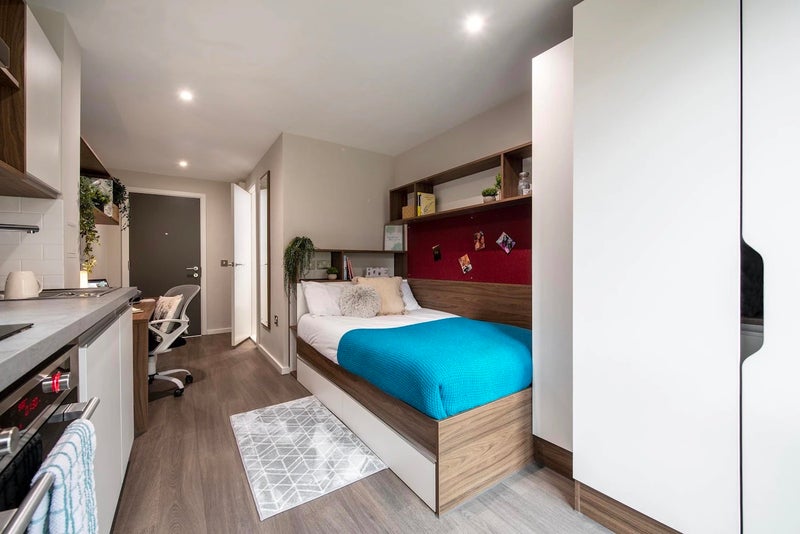 Bed, underbed storage, wardrobe, personal study space with desk and chair