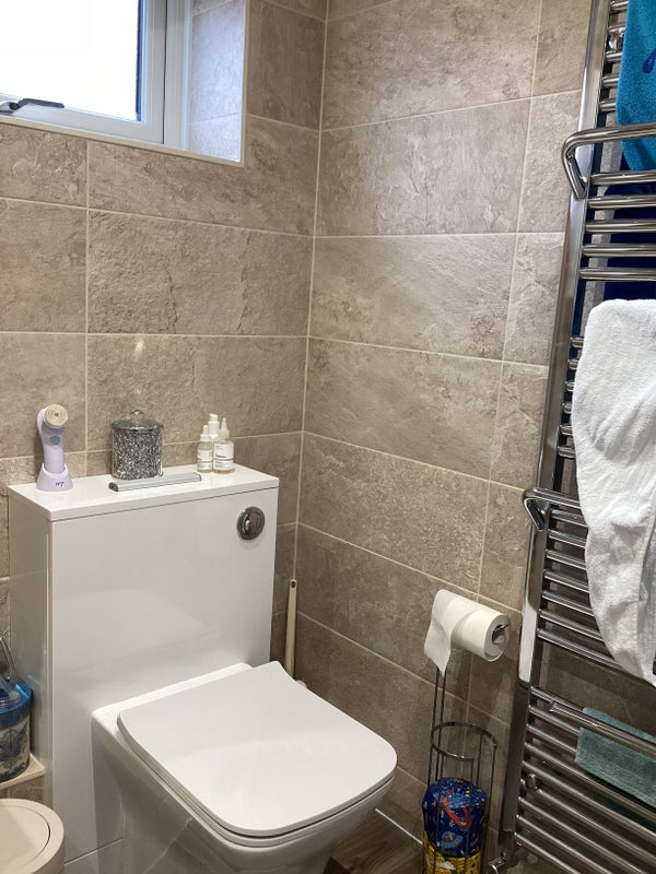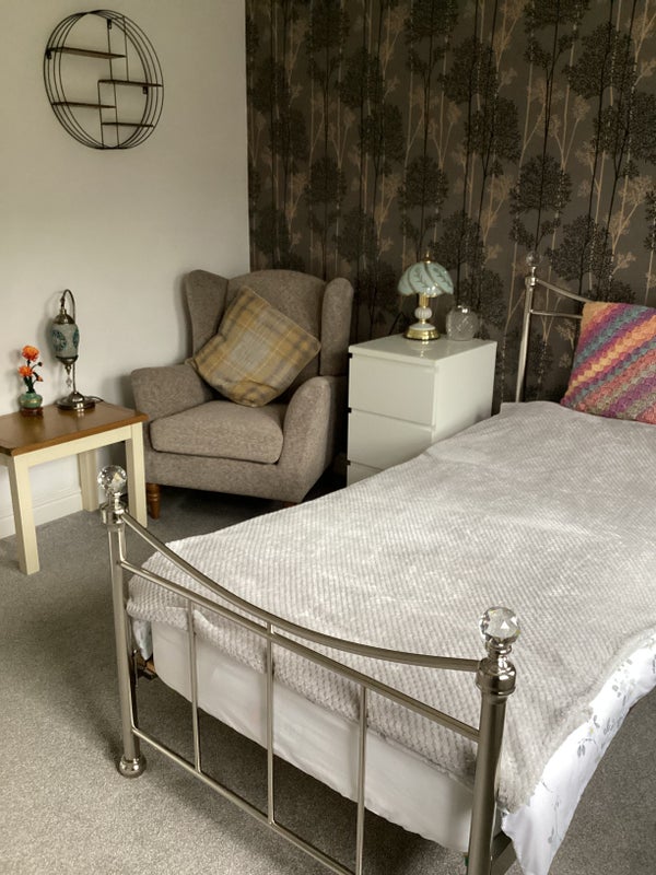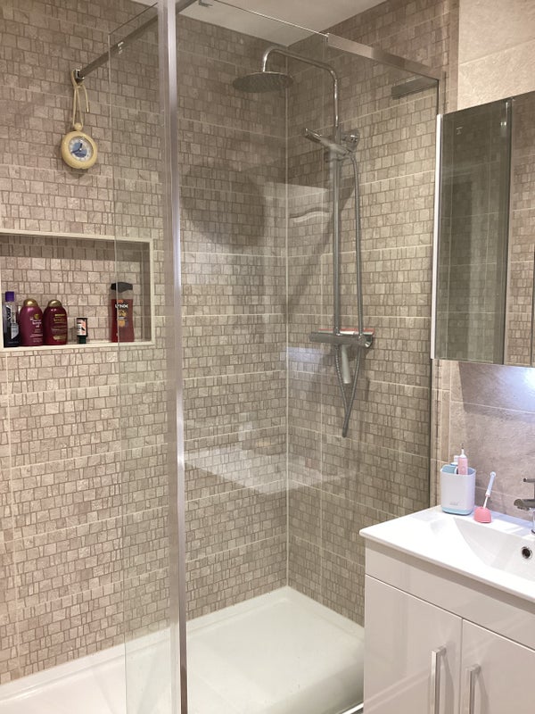 Nicely furnished, large double sized room with built in wardrobes, single bed, bedside cabinet and a comfortable new armchair with coffee table. Shared kitchen and modern bathroom with rain shower. Additional downstairs toilet.