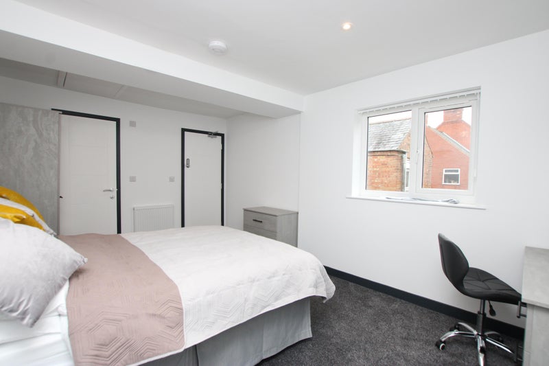 The room comes complete with a double bed, grey matching bedside cabinet, chest of drawers, 2 door wardrobe & desk with swivel chair, fridge and smart TV. The ensuite features a built in wash basin and shower room. Modern furnishings throughout.