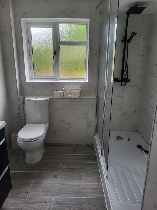 A white, fully tiled bathroom with a powerful hot shower and toilet.