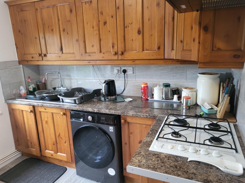 Big kitchen area with Gas hob, Microwave, Toaster, Kettle, Fridge freezer, and washing machine.