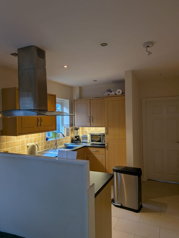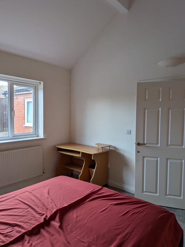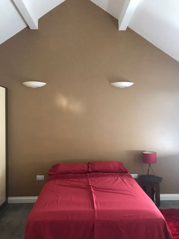 This is a very comfortable, large and modern double bedroom with a desk and a whole wall of built-in cupboard and wardrobe space. There are high/vaulted ceilings providing a sense of space. I just had the carpet professionally cleaned and the room has been redecorated. The double bed has a new high quality and very comfortable mattress.