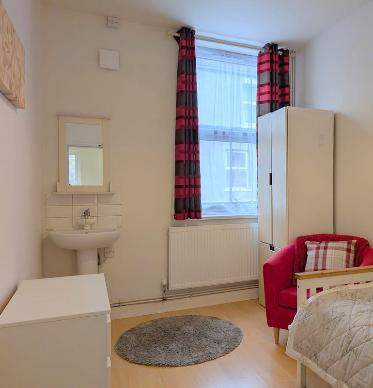 Located on the ground floor, this single room is fully furnished, which includes a single bed, bedside cabinet, chest of drawers, armchair and freestanding wardrobe.