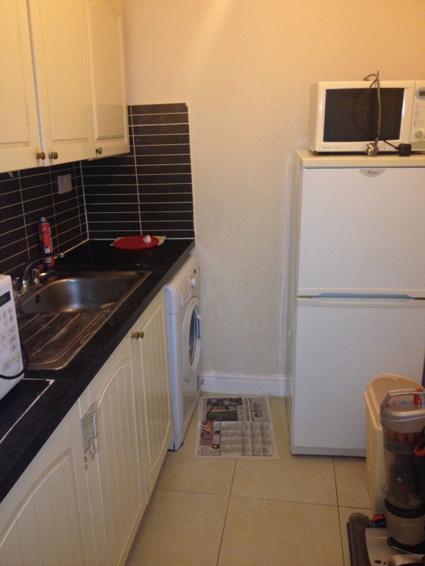 Kitchenette with sink, cupboards, fridge freezer, washing machine and microwave.