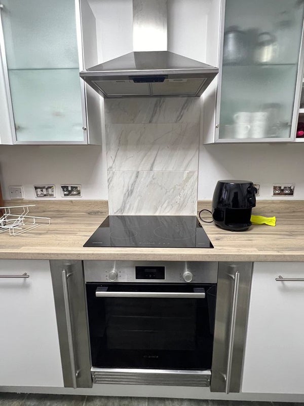 Fully equipped kitchen with Appliances - Microwave, Air fryer, Electric Kettle, Hob, Hood, Oven, Dishwasher, Toaster, Pots and pans, cutlery and plates
