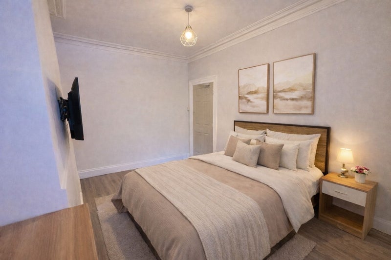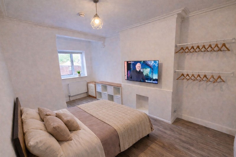 • Fully furnished room with memory foam mattress, wardrobes, bedside table, and chest of drawers