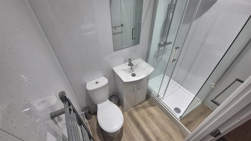 The bedroom is fully furnished with a bed, wardrobe and bedside table and benefits from its own spacious en-suite, complete with a large shower, WC, and wash basin set within a vanity unit with mirror above.