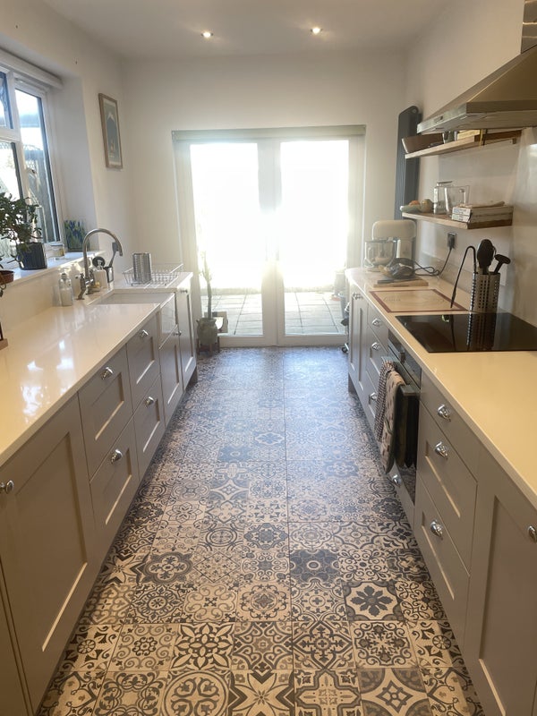 There is a well-furnished, decent sized kitchen looking out onto a patio garden.