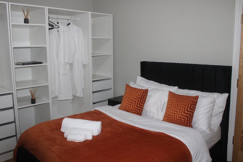 A spacious, fully furnished double room with a comfortable bed and large wardrobe space — plenty of storage and natural light. Ready to move straight in with no hassle.