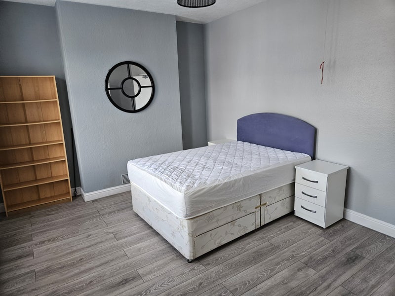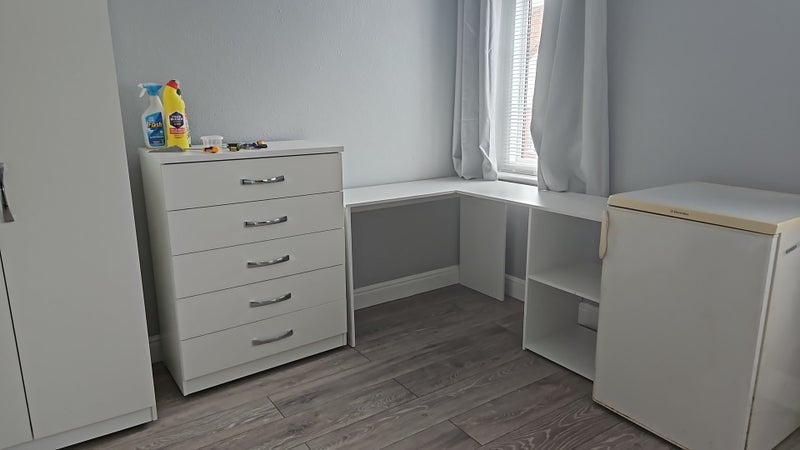 The room has a double bed, wardrobes, table, chair and fridge freezer.