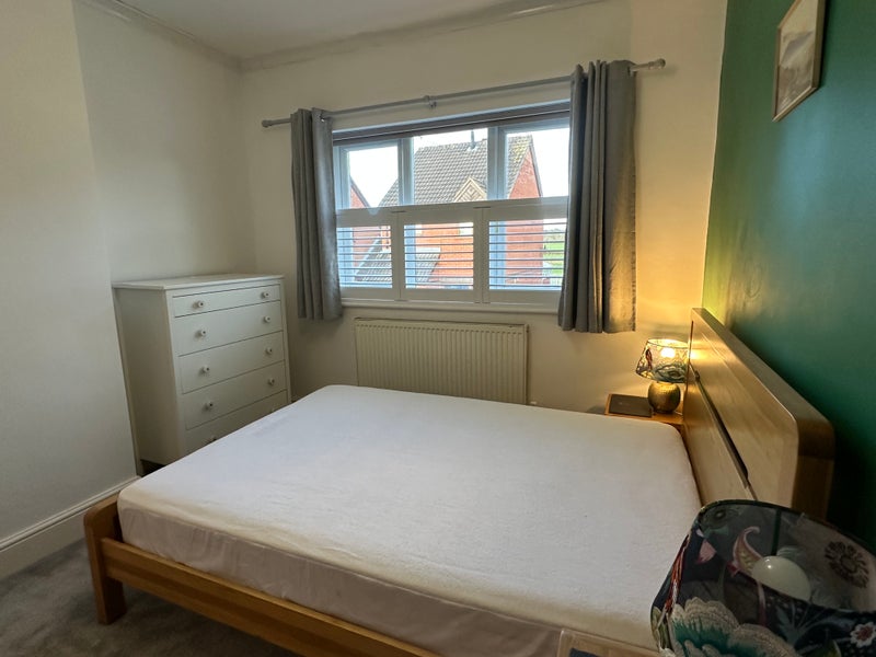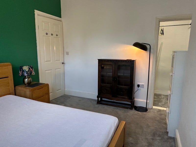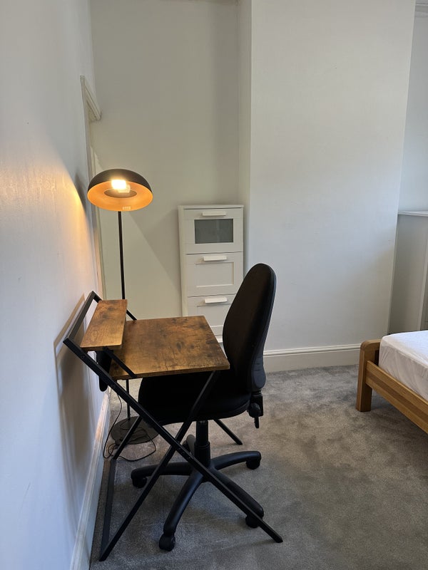 The room is a bright, fully furnished double with a bed, large wardrobe, chest of drawers, tall boy and the option of a desk or bookcase (both shown in pics). Blackout blinds and shutters make it comfortable for a good night’s sleep. There will most likely be a second room available in a few months.
