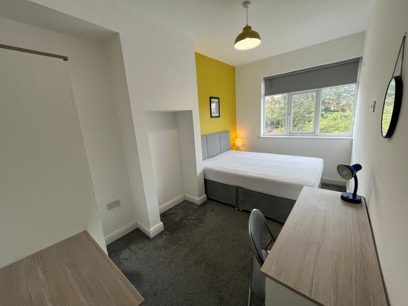 A bright double room featuring a stylish mustard yellow feature wall, located on the first floor of the house and overlooking the garden. The room shares a bathroom on the ground floor with just one other tenant, with a total of three bathrooms available within the property.