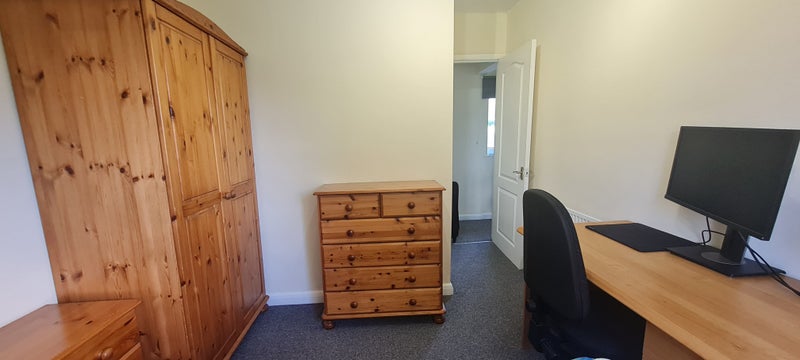 The double bedroom is fitted with a wardrobe, a chest of drawers, a single bed and an office desk.