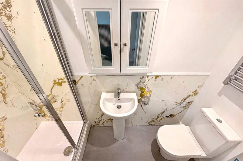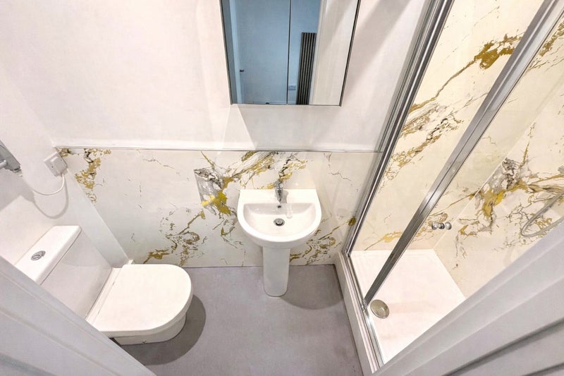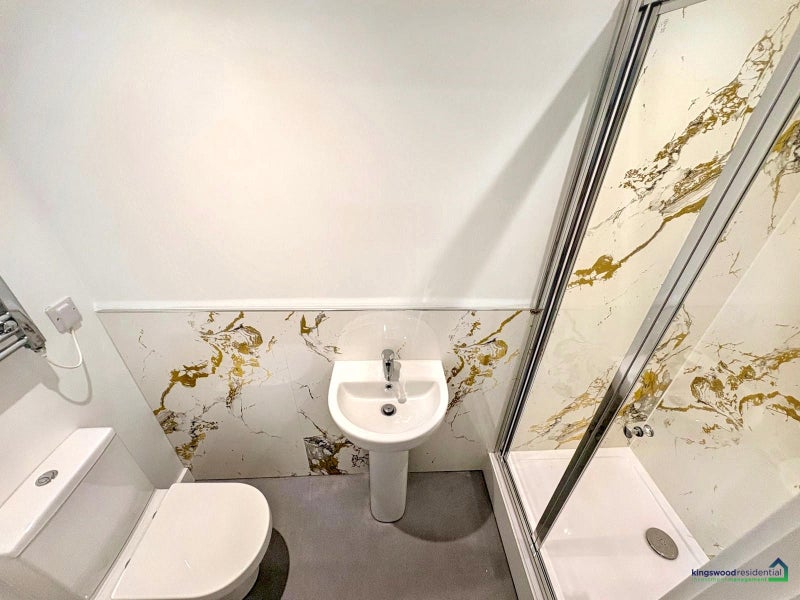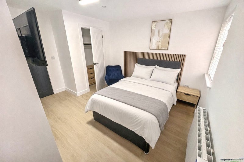 A furnished double bedroom with en-suite, inclusive of all bills. The room is furnished with a double bed, mattress, wall mounted smart TV, accent chair, kitchenette area with an undercounter fridge/freezer and worktop. Built in wardrobe with chest of drawers. The en-suite shower room includes a shower, WC, sink and wall mounted mirrored unit (2.42m x 0.88m.) Low security deposit of £300.