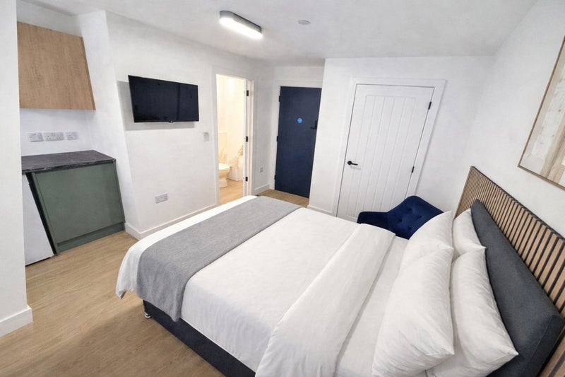 A furnished double bedroom with en-suite, inclusive of all bills. The room is furnished with a double bed, mattress, wall mounted smart TV, accent chair, kitchenette area with an undercounter fridge/freezer and worktop. Built in wardrobe with chest of drawers. The en-suite shower room includes a shower, WC, sink and wall mounted mirrored unit (2.38m x 0.85m.) Low security deposit of £300.