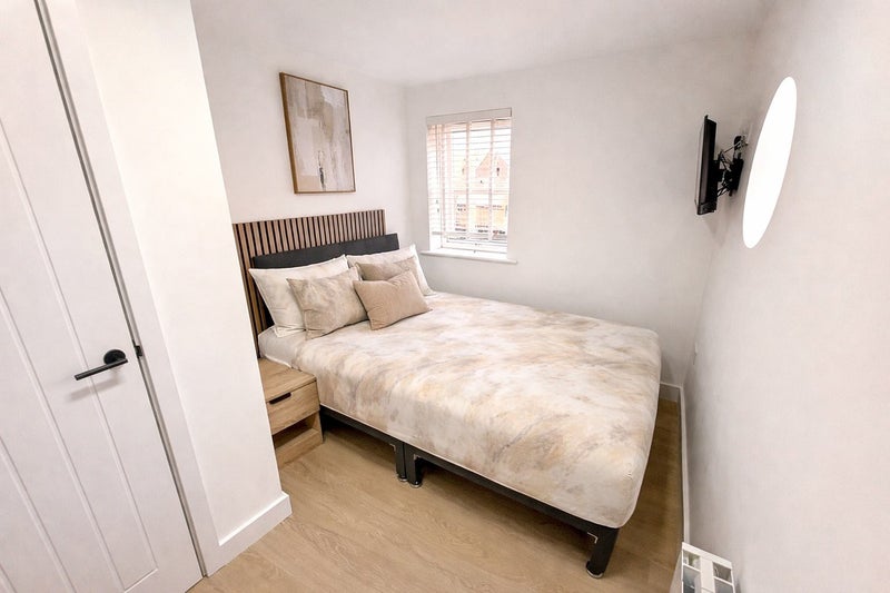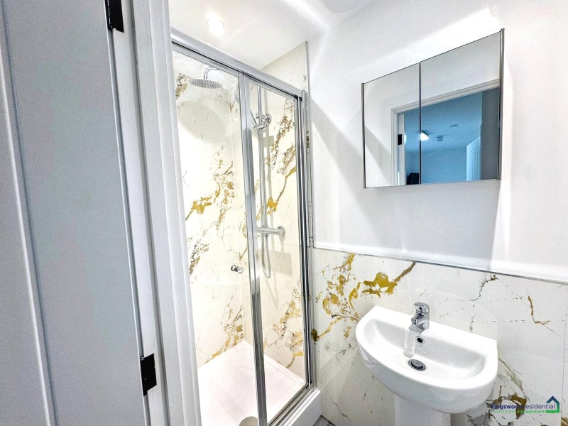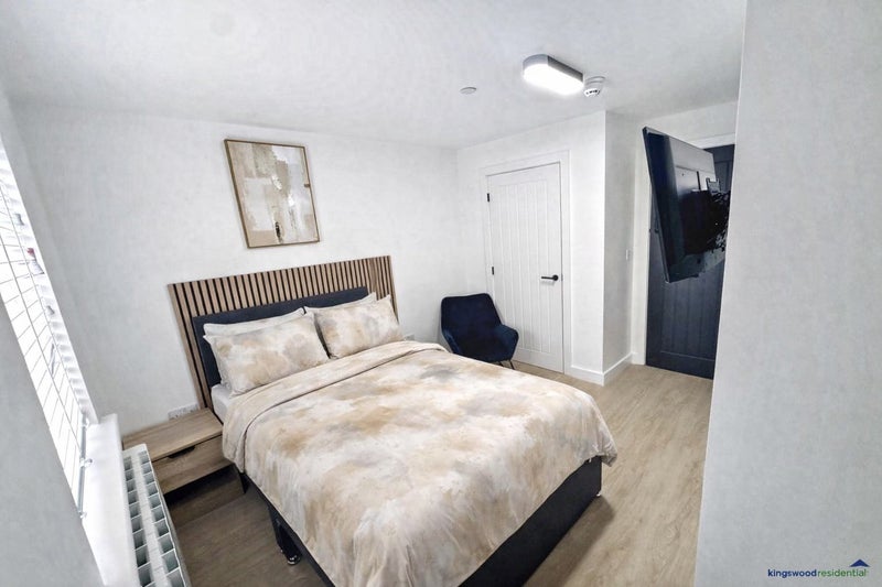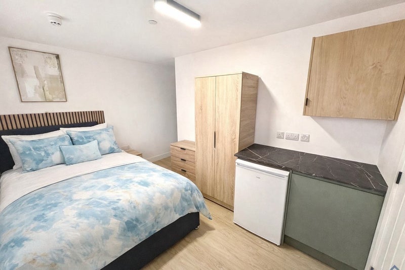 A furnished double bedroom with en-suite, inclusive of all bills. The room is furnished with a double bed, mattress, wall mounted smart TV, kitchenette area with an undercounter fridge/freezer and worktop. Built in wardrobe with chest of drawers. The en-suite shower room includes a shower, WC, sink and wall mounted mirrored unit (0.85m x 2.30m.) Low security deposit of £300.