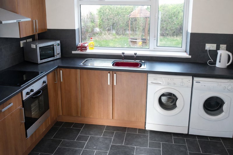 Shared communal kitchen with dining table, washing machine & tumble drier.